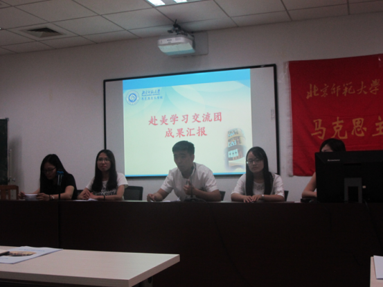 首先,2016年暑期赴美交流学习团成员张靓雪同学为与会师生播放了赴美学习交流期间的视频短片。随后,李海红同学与大家一起分享了自己两周学习的行程和感悟。她着重介绍了大家准备创业计划大赛的产品——“妥妥地”校园外卖APP。接着,盖梦洁同学为大家介绍了在美国所感受到的高科技成果。除了参观著名企业,她着重介绍了大家参加创业计划大赛的产品——拼房APP。她从项目背景、准备过程以及最终成果三方面进行汇报。苏晓微同学从饮食文化、社交文化、影视文化、人文关怀等方面分享了在美国的文化体验以及自身感悟。刘成志同学从知识获取、团队合作以及文化体验三个方面进行了总结。他强调,同学们一定要重视英语的学习,这不仅是一种知识获取的途径,还是一种表达自我的渠道。他以生动的故事说明了团队合作的重要性以及中美文化的差异性,引发了同学们的思考。